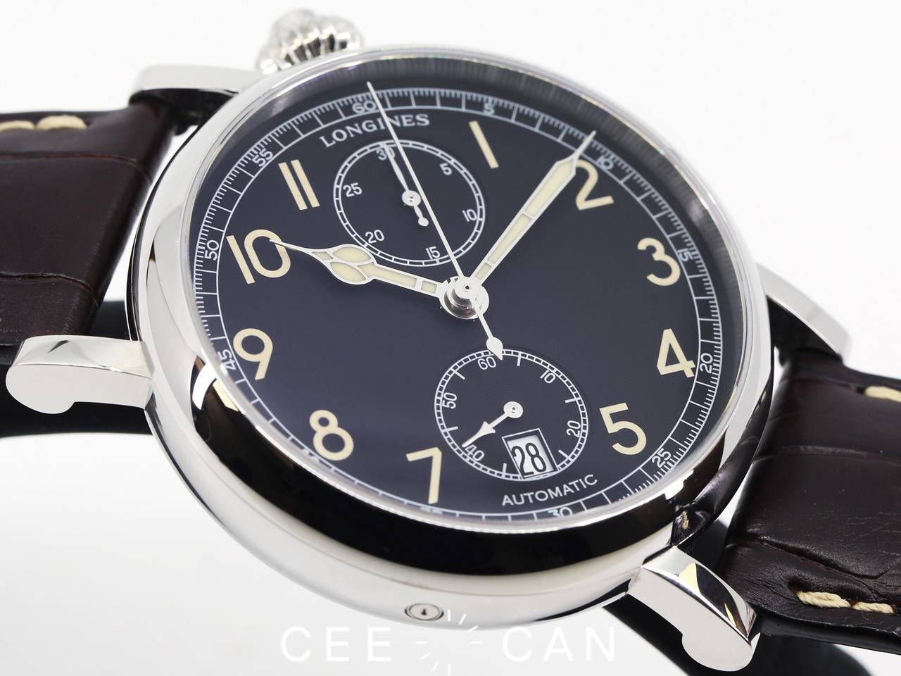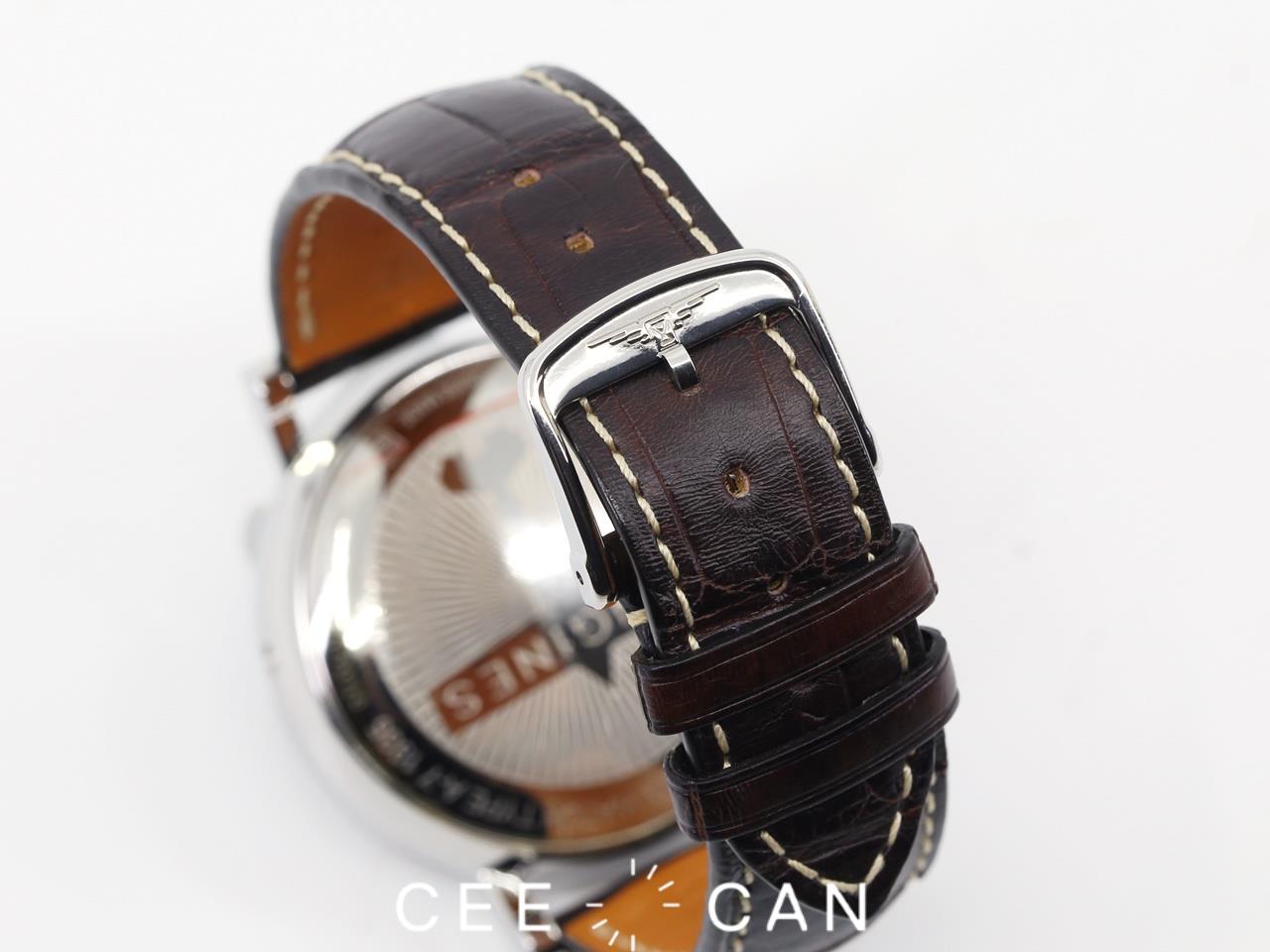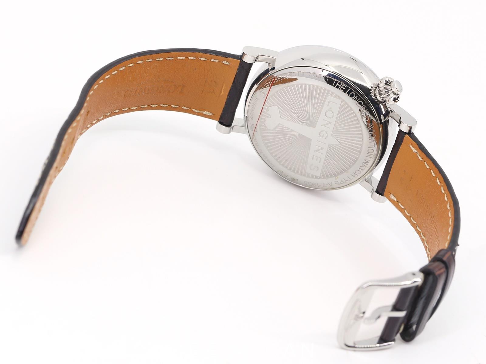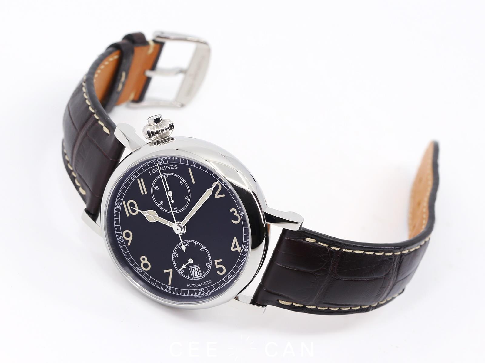 41mm stainless steel watch case with a solid case back. Round sapphire crystal glass. Black dial with silver hands and Arabic numeral hour markers. Date window at 8 o'clock. Chronograph function operates via the mono-pusher at the crown. Longines Cal. L788.2 automatic chronograph movement with 54 hours of power reserve. Original dark brown alligator strap with steel pin buckle. The watch is in excellent condition , with scratches on the case. Comes with the original box, manual, and warranty card.