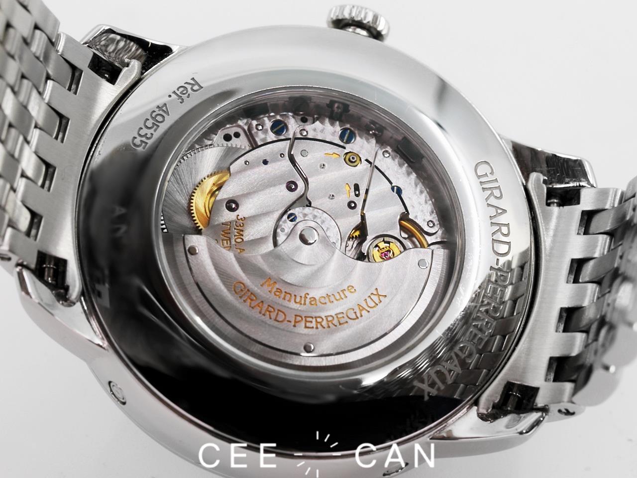 40mm不锈钢表壳及原装钢表带,拱形蓝宝石水晶镜面及透视表底。银表盘上有日,月,星期及月相显示,表壳侧按钮作调整。GP自家Cal.03300自动机心,46小时动力储备。此表整体状态极佳只有轻微使用痕迹。全套有盒有保用证。另附送GP原厂16mm不锈钢针扣一枚。