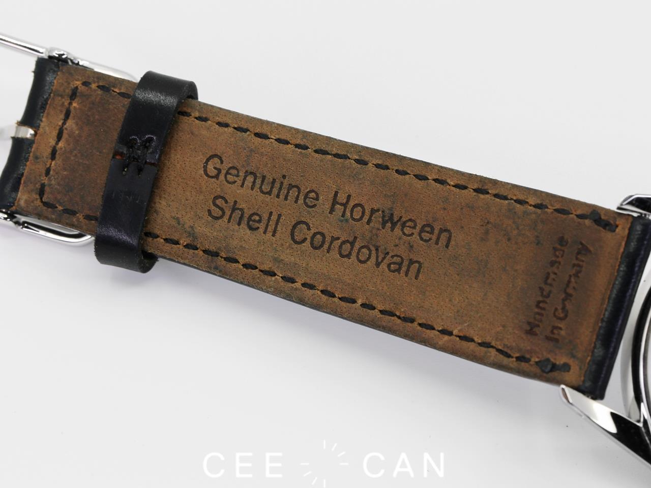 40.5mm不銹鋼錶殼,藍寶石水晶玻璃錶面及透視底蓋。獨特橄欖綠錶面配以金色時分秒針及時標,6時位置有小秒針,3時位置設有配色日曆窗。Nomos Neomatik DUW6106自動機芯,是廠方首枚附快調日曆系統的機芯。原廠黑色Horween Shell Cordovan臀皮革製錶帶接近未使用(底層深色部份是皮革製作過程的自然痕跡),配原廠不銹鋼方形針扣。此表狀況極佳沒有明顯使用痕跡。附原裝錶盒,皮夾,保用證(2021/2)及清潔抹布。