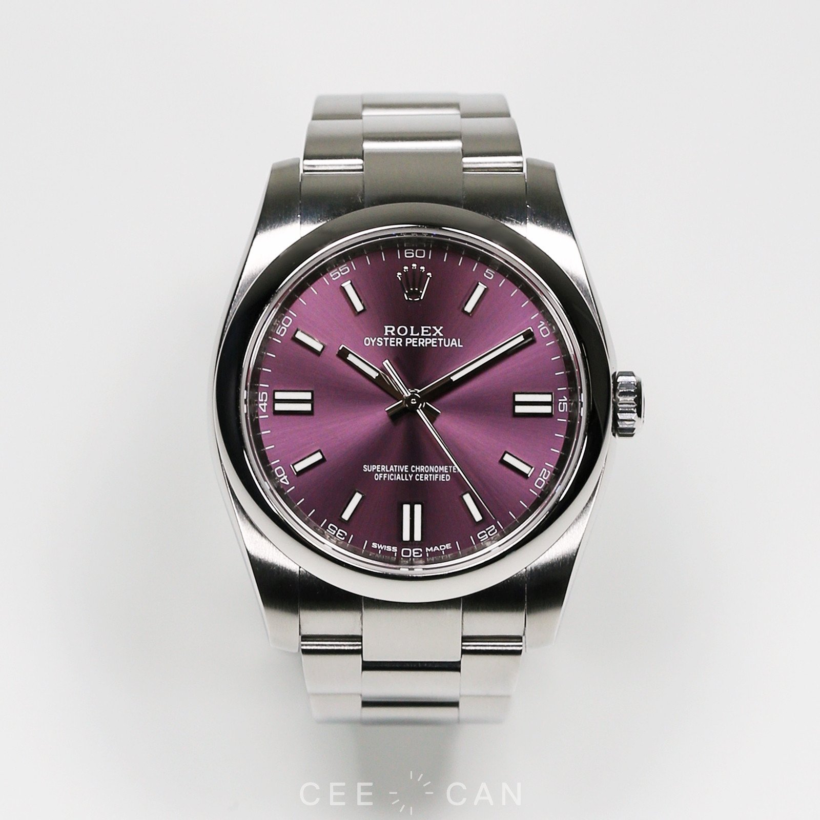 36mm不銹鋼蠔式錶殼及錶底,藍寶石水晶錶面,紫色(紅葡萄)色放射紋錶面,白金指針及條狀時標。原廠蠔式不銹鋼錶帶,13格。勞力士Cal.3130自動機芯,COSC天文臺認證。此錶有輕微使用痕跡但整體狀態優良。全套齊包括盒/證/說明書/掛牌。這是一款富注目度的大熱勞力士款式。